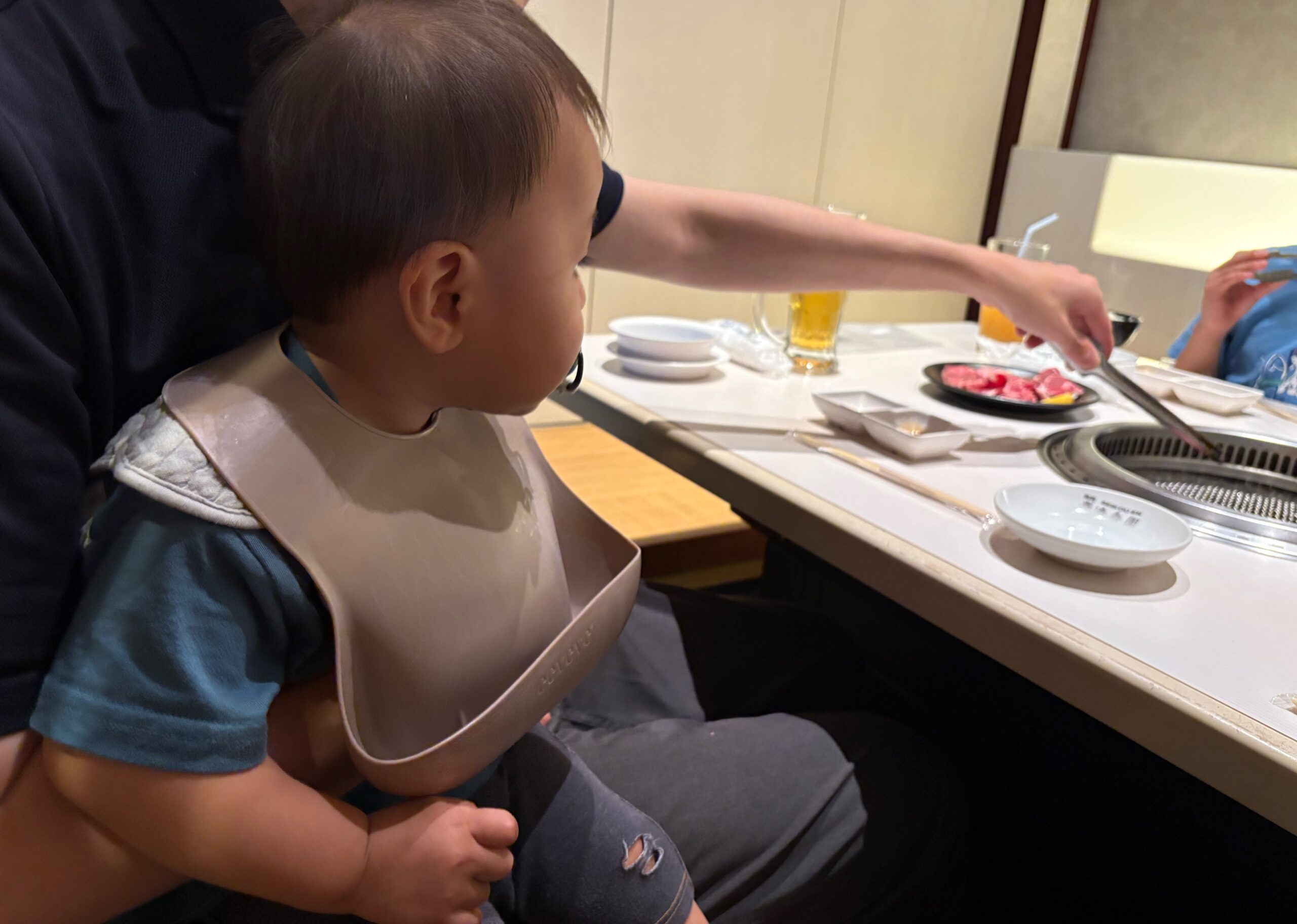 ただ、1歳児を連れての焼肉は大変だった。。お昼寝をしっかりさせてから行けばよかったなぁと反省。レトルトの離乳食(親子丼)を持参して順調に食べてくれたんだけど、食べ終わってから眠かったのかぐずぐずになってしまった。グズグズでも食欲はあるみたいで、私のお肉とご飯を少しずつ あげちゃいました。ちょっと味が濃かったかな。。でも焼肉はやっぱり美味しそうに食べてしばらくモグモグと食べている間はおとなしくしてくれるから助かった😆